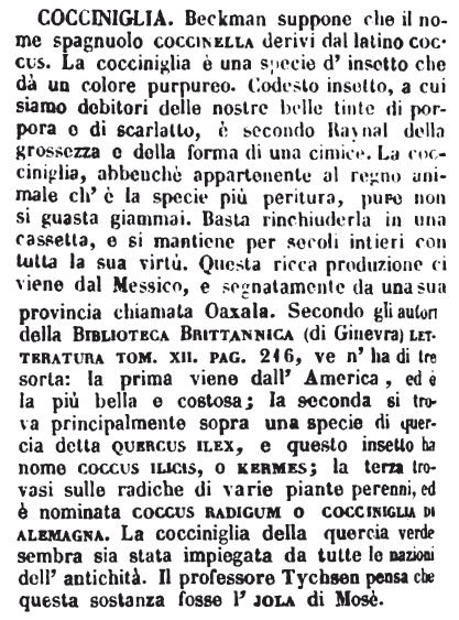 | Cocciniglia - Beckman suppone che il nome spagnuolo coccinella derivi dal latino coccus. La cocciniglia è una specie d'insetto che dà un colore purpureo. Codesto insetto, a cui siamo debitori delle nostre belle tinte di porpora e di scarlatto, è secondo Raynal della grossezza e della forma di una cimice. La cocciniglia, abbenchè appartenente al regno animale ch'è la specie più peritura, pure non si guasta giammai. Basta rinchiuderla in una cassetta, e si mantiene per secoli intieri con tutta la sua virtù. Questa ricca produzione ci viene dal Messico, e segnatamente da una sua provincia chiamata Oaxala. Secondo gli autori della Biblioteca Brittannica (di Ginevra) letteratura tom. XII. pag. 216, ve n'ha di tre sorta: la prima viene dall'America, ed è la più bella e costosa; la seconda si trova principalmente sopra una specie di quercia detta quercus ilex, e questo insetto ha nome coccus ilicis, o kermes; la terza trovasi sulle radiche di varie piante perenni, ed è nominata coccus radigum o cocciniglia di alemagna. La cocciniglia della quercia verde sembra sia stata impiegata da tutte le nazioni dell'antichità. Il professore Tychsen pensa che questa sostanza fosse l'jola di Mosè. [immagine] |