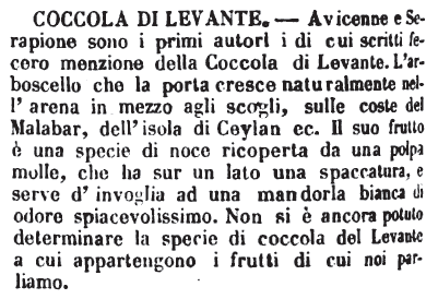 | Coccola di levante - Avicenne e Serapione sono i primi autori i di cui scritti fecero menzione della Coccola di Levante. L'arboscello che la porta cresce naturalmente nell'arena in mezzo agli scogli, sulle coste del Malabar, dell'isola di Ceylan ec. Il suo frutto è una specie di noce ricoperta da una polpa molle, che ha sur un lato una spaccatura, e serve d'invoglia ad una mandorla bianca di odore spiacevolissimo. Non si è ancora potuto determinare la specie di coccola del Levante a cui appartengono i frutti di cui noi parliamo. [immagine] |