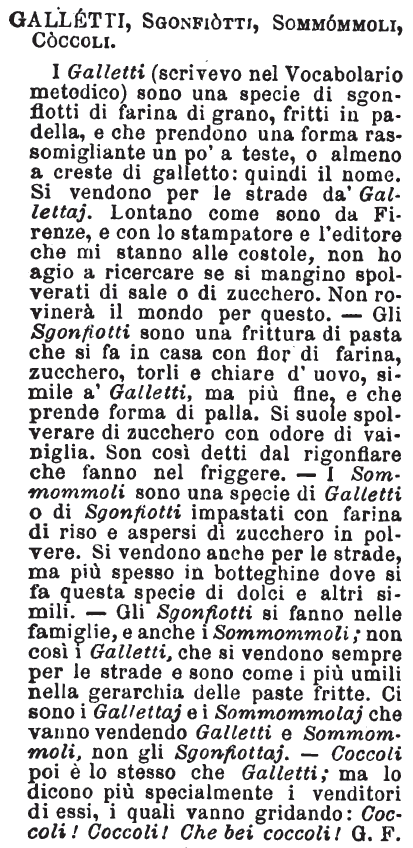 | Galletti, Sgonfiotti, Sommommoli, Coccoli - I Galletti (scrivevo nel Vocabolario metodico) sono una specie di sgonfiotti di farina di grano, fritti in padella, e che prendono una forma rassomigliante un po' a teste, o almeno a creste di galletto: quindi il nome. Si vendono per le strade da' Gallettaj. Lontano come sono da Firenze, e con lo stampatore e l'editore che mi stanno alle costole, non ho agio a ricercare se si mangino spolverati di sale o di zucchero. Non rovinerà il mondo per questo. - Gli Sgonfiotti sono una frittura di pasta che si fa in casa con fior di farina, zucchero, torli e chiare d'uovo, simile a' Galletti, ma più fine, e che prende forma di palla. Si suole spolverare di zucchero con odore di vainiglia. Son così detti dal rigonfiare che fanno nel friggere. - I Sommommoli sono una specie di Galletti o di Sgonfiotti impastati con farina di riso e aspersi di zucchero in polvere. Si vendono anche per le strade, ma più spesso in botteghine dove si fa questa specie di dolci e altri simili. - Gli Sgonfiotti si fanno nelle famiglie, e anche i Sommommoli; non così i Galletti, che si vendono sempre per le strade e sono come i più umili nella gerarchia delle paste fritte. Ci sono i Gallettaj e i Sommommolaj che vanno vendendo Galletti e Sommommoli, non gli Sgonfiottaj. - Coccoli poi è lo stesso che Galletti; ma lo dicono più specialmente i venditori di essi, i quali vanno gridando: Coccoli! Coccoli! Che bei coccoli! G. F. [immagine] |