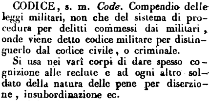 | Codice - s. m. Code. Compendio delle leggi militari, non che del sistema di procedura per delitti commessi dai militari, onde viene detto codice militare per distinguerlo dal codice civile, o criminale.