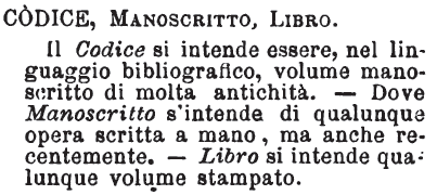 | Codice, Manoscritto, Libro - Il Codice si intende essere, nel linguaggio bibliografico, volume manoscritto di molta antichità. Dove Manoscritto s'intende di qualunque opera scritta a mano, ma anche recentemente. Libro si intende qualunque volume stampato. [immagine] |