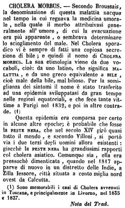 (1) Sono memorabili i casi di Cholera avvenuti in Toscana, e principalmente in Livorno, nel 1835 e 1837.