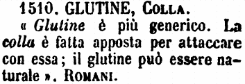 | Glutine, Colla - «Glutine è più generico. La colla è fatta apposta per attaccare con essa; il glutine può essere naturale». Romani. [immagine] |