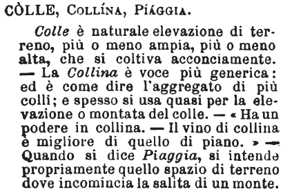 | Colle, Collina, Piaggia - Colle è naturale elevazione di terreno, più o meno ampia, più o meno alta, che si coltiva acconciamente. - La Collina è voce più generica: ed è come dire l'aggregato di più colli; e spesso si usa quasi per la elevazione o montata del colle. - «Ha un podere in collina. - Il vino di collina è migliore di quello di piano.» - Quando si dice Piaggia, si intende propriamente quello spazio di terreno dove incomincia la salita di un monte. [immagine] |
