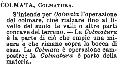 | Colmata, Colmatura, Colmo - «Colmata è l’operazione del colmare le valli o altre parti concave del terreno». Tommaseo.