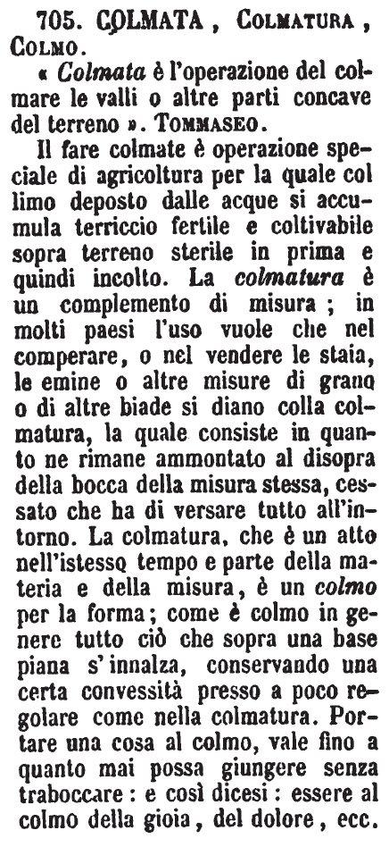Colmata, Colmatura, Colmo - «Colmata è l’operazione del colmare le valli o altre parti concave del terreno». Tommaseo.
