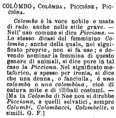 | Colombo, Colomba, Piccione, Picciona - Colombo è la voce nobile e usata di rado anche nello stile grave. - Nell'uso comune si dice Piccione. - Lo stesso dicasi del femminino Colomba; anche della quale, nel significato proprio, non si fa uso; e dovendo nominar la femmina di questo genere di animali, si dice pure in tal caso la Picciona. Nel significato metaforico, e spesso per ironia, si dice che una donna, o fanciulla, è una colomba o una colombina, cioè di natura mite e di illibati costumi. - [Ma la Colomba di Noè non si direbbe Picciona, e quelli selvatici, sempre Colombi, Colombacci, Colombelle, e simili. G. F.] [immagine] |