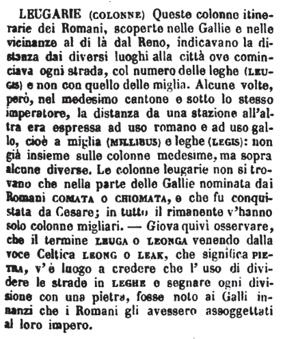 | Leugarie (Colonne) - Queste colonne itinerarie dei Romani, scoperte nelle Gallie e nelle vicinanze al di là dal Reno, indicavano la distanza dai diversi luoghi alla città ove cominciava ogni strada, col numero delle leghe (leugis) e non con quello delle miglia. Alcune volte, però, nel medesimo cantone e sotto lo stesso imperatore, la distanza da una stazione all'altra era espressa ad uso romano e ad uso gallo, cioè a miglia (millibus) e leghe (legis): non già insieme sulle colonne medesime, ma sopra alcune diverse. Le colonne leugarie non si trovano che nella parte delle Gallie nominata dai Romani comata o chiomata, e che fu conquistata da Cesare; in tutto il rimanente v'hanno solo colonne migliari. - Giova quivi osservare, che il termine leuga o leonga venendo dalla voce Celtica leong o leak, che significa pietra, v'è luogo a credere che l'uso di dividere le strade in leghe e segnare ogni divisione con una pietra, fosse noto ai Galli innanzi che i Romani gli avessero assoggettati al loro impero. [immagine] |