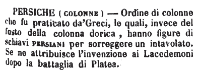 | Persiche (Colonne) - Ordine di colonne che fu praticato da' Greci, le quali, invece del fusto della colonna dorica, hanno figure di schiavi persiani per sorreggere un intavolato. Se ne attribuisce l'invenzione ai Lacedemoni dopo la battaglia di Platea. [immagine] |