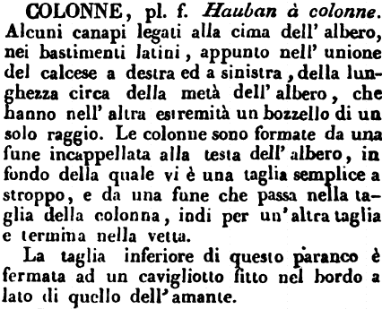 Colonne - pl. f. Hauban à colonne. Alcuni canapi legati alla cima dell'albero, nei bastimenti latini, appunto nell'unione del calcese a destra ed a sinistra, della lunghezza circa della metà dell'albero, che hanno nell'altra estremità un bozzello di un solo raggio. Le colonne sono formate da una fune incappellata alla testa dell'albero, in fondo della quale vi è una taglia semplice a stroppo, e da una fune che passa nella taglia della colonna, indi per un'altra taglia e termina nella vetta.