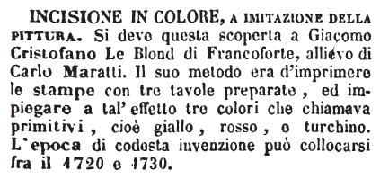 | Incisione in colore - a imitazione della pittura. Si deve questa scoperta a Giacomo Cristofano Le Blond di Francoforte, allievo di Carlo Maratti. Il suo metodo era d'imprimere le stampe con tre tavole preparate, ed impiegare a tal'effetto tre colori che chiamava primitivi, cioè giallo, rosso, e turchino. L'epoca di codesta invenzione può collocarsi fra il 1720 e 1730. [immagine] |