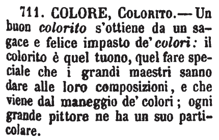 | Colore, Colorito - Un buon colorito s'ottiene da un sagace e felice impasto de' colori: il colorito è quel tuono, quel fare speciale che i grandi maestri sanno dare alle loro composizioni, e che viene dal maneggio de' colori; ogni grande pittore ne ha uno suo particolare. [immagine] |