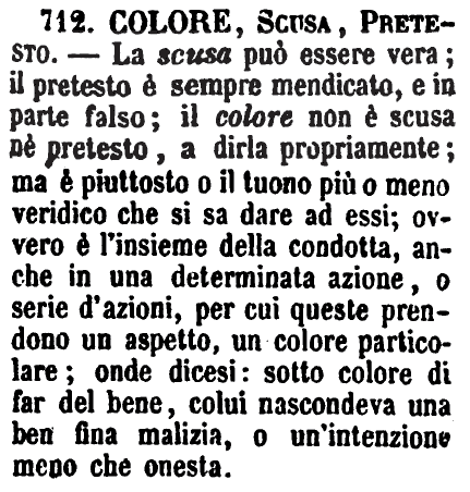 | Colore, Scusa, Pretesto - La scusa può essere vera; il pretesto è sempre mendicato, e in parte falso; il colore non è scusa né pretesto, a dirla propriamente; ma è piuttosto o il tuono più o meno veridico che si sa dare ad essi; ovvero è l'insieme della condotta, anche in una determinata azione, o serie d'azioni, per cui queste prendono un aspetto, un colore particolare; onde dicesi: sotto colore di far del bene, colui nascondeva una ben fina malizia, o un'intenzione meno che onesta. [immagine] |