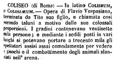 | Coliseo (di Roma) - In latino Coliseum, o Colossaeum. - Opera di Flavio Vespasiano, terminata da Tito suo figlio, e chiamata così secondo taluni a motivo delle sue colossali proporzioni. I gradini contenevano ventisettemila persone; e mediante i sedili posti in vari luoghi si potevano portare a trecento mila gli spettatori assisi assai comodamente per vedere i giuochi o il combattimento degli animali slanciati nell'area. [immagine] |