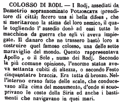| Colosso di rodi - I Rodj, assediati da Demetrio soprannominato Poliorcete (prenditore di città) fecero una sì bella difesa, che si meritarono la stima del loro nemico, il quale togliendo l'assedio donò ad essi tutte le macchine da guerra che egli vi aveva impiegate. Il danaro che ne trassero bastò loro a costruire quel famoso colosso, una delle sette maraviglie del mondo. Questo rappresentava Apollo, o il Sole, nume dei Rodj. Secondo la più comune opinione, l'enorme statua aveva settanta cubiti di altezza, o secondo Festo cinquantatre braccia. Era tutta di bronzo. Nell'interno erano fatte delle scale, che conducevano alla cima del monumento, d'onde si scuoprivano le coste della Siria ed anche i bastimenti che navigavano in quei mari. [immagine] |