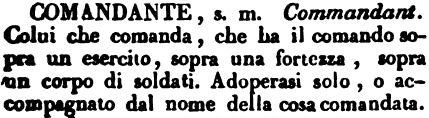 | Comandante - s. m. Commandant. Colui che comanda, che ha il comando sopra un esercito, sopra una fortezza, sopra un corpo di soldati. Adoperasi solo, o accompagnato dal nome della cosa comandata. [immagine] |