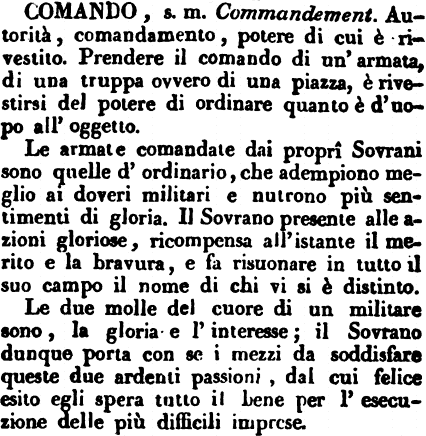 | Comando - s. m. Commandement. Autorità, comandamento, potere di cui è rivestito. Prendere il comando di un'armata, di una truppa ovvero di una piazza, è rivestirsi del potere di ordinare quanto è d'uopo all'oggetto.