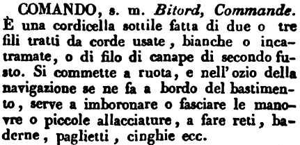 | Comando - s. m. Bitord, Commande. È una cordicella sottile fatta di due o tre fili tratti da corde usate, bianche o incatramate, o di filo di canape di secondo fusto. Si commette a ruota, e nell'ozio della navigazione se ne fa a bordo del bastimento, serve a imboronare o fasciare le manovre o piccole allacciature, a fare reti, baderne, paglietti, cinghie ecc. [immagine] |
