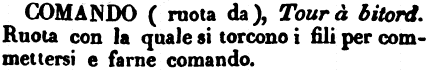 | Comando (ruota da) - Tour à bitord. Ruota con la quale si torcono i fili per commettersi e farne comando. [immagine] |