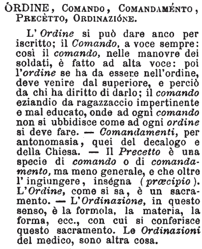| Ordino, Comando, Comandamento, Precetto, Ordinazione - L'ordine si può dare anco per iscritto; il comando, a voce sempre: così il comando, nelle manovre dei soldati, è fatto ad alta voce: poi l'ordine, se ha da essere nell'ordine, deve venire dal superiore, e perciò da chi ha diritto di darlo; il comando eziandio da ragazzaccio impertinente e mal educato, onde ad ogni comando non si ubbidisce come ad ogni ordine si deve fare. Comandamenti, per antonomasia, quei del decalogo e della Chiesa: il precetto è una specie di comando o di comandamento, ma meno generale, e che oltre lo ingiungere, insegna (præcipio). L'ordine, come si sa, è un sacramento; l'ordinazione, in questo senso, è la formola, la materia, la forma ecc. con cui si conferisce questo sacramento. Le ordinazioni del medico sono altra cosa. [immagine] |