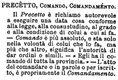 | Precetto, Comando, Comandamento - Il Precetto è richiamo autorevole a eseguire una data cosa conforme alla legge, alla consuetudine, al grado e alla condizione di colui a cui si fa. - Comando è più assoluto, e sta solo nella volontà di colui che lo fa, ma più che altro, significa l'autorità di dar ordini o simili. - «Egli ha il comando di tutta la provincia.» - L'atto del comandare o in parole o per iscritto, è propriamente il Comandamento. [immagine] |