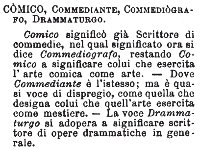 | Comico, Commediante, Commediografo, Drammaturgo - Comico significò già Scrittore di commedie, nel qual significato ora si dice Commediografo, restando Comico a significare colui che esercita l'arte comica come arte. - Dove Commediante è l'istesso; ma è quasi voce di dispregio, come quella che designa colui che quell'arte esercita come mestiere. - La voce Drammaturgo si adopera a significare scrittore di opere drammatiche in generale. [immagine] |