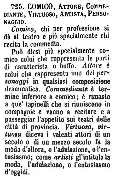Può dirsi più specialmente comico colui che rappresenta le parti di caratterista o buffo. Attore è colui che rappresenta uno dei personaggi in qualsiasi composizione drammatica. Commediante è termine inferiore a comico; è rimasto a que' tapinelli che si riuniscono in compagnie e vanno a recitare e a passeggiar l'appetito sui teatri delle città di provincia. Virtuoso, virtuosa diceva i valenti attori di un secolo o di un mezzo secolo fa la moda d'allora, o l'adulazione, o l'entusiasmo; come artisti gl'intitola la moda, l'adulazione, o l'entusiasmo d'oggidì. [immagine] |