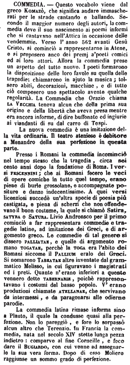 | Commedia - Questo vocabolo viene dal greco Komazò, che significa andare immascherati per le strade cantando e ballando. Secondo il maggior numero degli autori, la commedia deve il suo nascimento ai poemi informi che si cantavano nell'Attica in occasione delle vendemmie. Verso l'anno 562 avanti Gesù Cristo, si cominciò a rappresentarne in Atene, e si proposero anco dei premj a' poeti comici ed ai loro attori. Allora la commedia prese un aspetto del tutto nuovo. I poeti formarono la disposizione delle loro favole su quella delle tragedie; chiamarono in ajuto la musica; tolsero abiti, decorazioni, macchine, e di tutto ciò composero uno spettacolo avente qualche regolarità. La Commedia che Orazio chiama la Vecchia teneva alcun che della prima sua origine e della libertà che aveva presa mentre era ancora informe, di dire buffonate ed ingiurie ai viandanti di su dal carro di Tespi.