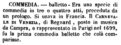| Commedia - - balletto - Era una specie di commedia in tre o quattro atti, preceduta da un prologo. Si usava in Francia. Il Carnevale di Venezia, di Regnard, posto in musica da Campra, e rappresentato in Parigi nel 1699, fu la prima commedia balletto che colà comparisse. [immagine] |