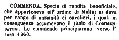 | Commenda - Specie di rendita beneficiale, che apparteneva all'ordine di Malta; si dava per rango di anzianità ai cavalieri, i quali in conseguenza assumevano il titolo di Commendatori. Le commende principiarono verso l'anno 1260. [immagine] |