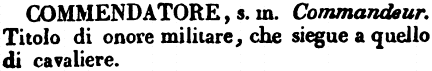 | Commendatore - s. m. Commandeur. Titolo di onore militare, che siegue a quello di cavaliere. [immagine] |