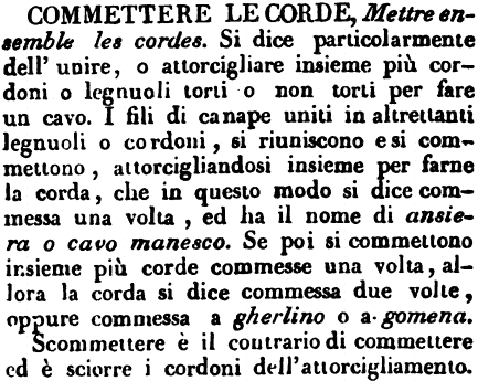 | Commettere le corde - Mettre ensemble les cordes. Si dice particolarmente dell'unire, o attorcigliare insieme più cordoni o legnuoli torti o non torti per fare un cavo. I fili di canape uniti in altrettanti legnuoli o cordoni, si riuniscono e si commettono, attorcigliandosi insieme per farne la corda, che in questo modo si dice commessa una volta, ed ha il nome di ansiera o cavo manesco. Se poi si commettono insieme più corde commesse una volta, allora la corda si dice commessa due volte, oppure commessa a gherlino o a gomena.