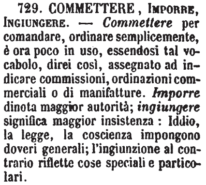 | Commettere, Imporre, Ingiungere - Commettere per comandare, ordinare semplicemente, è ora poco in uso, essendosi tal vocabolo, direi così, assegnato ad indicare commissioni, ordinazioni commerciali o di manifatture. Imporre dinota maggior autorità; ingiungere significa maggior insistenza: Iddio, la legge, la coscienza impongono doveri generali; l'ingiunzione al contrario riflette cose speciali e particolari. [immagine] |