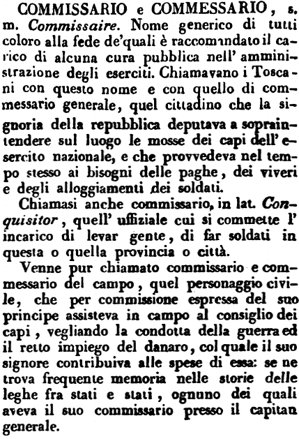 | Commissario e Commessario - s. m. Commissaire. Nome generico di tutti coloro alla fede de' quali è raccomandato il carico di alcuna cura pubblica nell'amministrazione degli eserciti. Chiamavano i Toscani con questo nome e con quello di commessario generale, quel cittadino che la signoria della repubblica deputava a sopraintendere sul luogo le mosse dei capi dell'esercito nazionale, e che provvedeva nel tempo stesso ai bisogni delle paghe, dei viveri e degli alloggiamenti dei soldati.