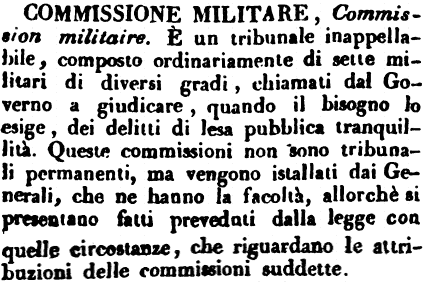 | Commissione militare - Commission militaire. È un tribunale inappellabile, composto ordinariamente di sette militari di diversi gradi, chiamati dal Governo a giudicare, quando il bisogno lo esige, dei delitti di lesa pubblica tranquillità. Queste commissioni non sono tribunali permanenti, ma vengono istallati dai Generali, che ne hanno la facoltà, allorchè si presentano fatti preveduti dalla legge con quelle circostanze, che riguardano le attribuzioni delle commissioni suddette. [immagine] |
