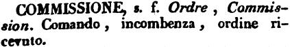 | Commissione - s. f. Ordre, Commission. Comando, incombenza, ordine ricevuto. [immagine] |
