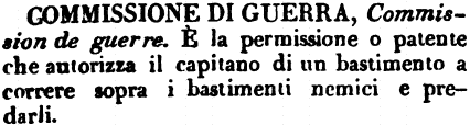 | Commissione di guerra - Commission de guerre. È la permissione o patente che autorizza il capitano di un bastimento a correre sopra i bastimenti nemici e predarli. [immagine] |