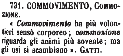 | Commovimento, Commozione - «Commovimento ha più volontieri senso corporeo; commozione riguarda gli animi più sovente; ma gli usi si scambiano». Gatti. [immagine] |