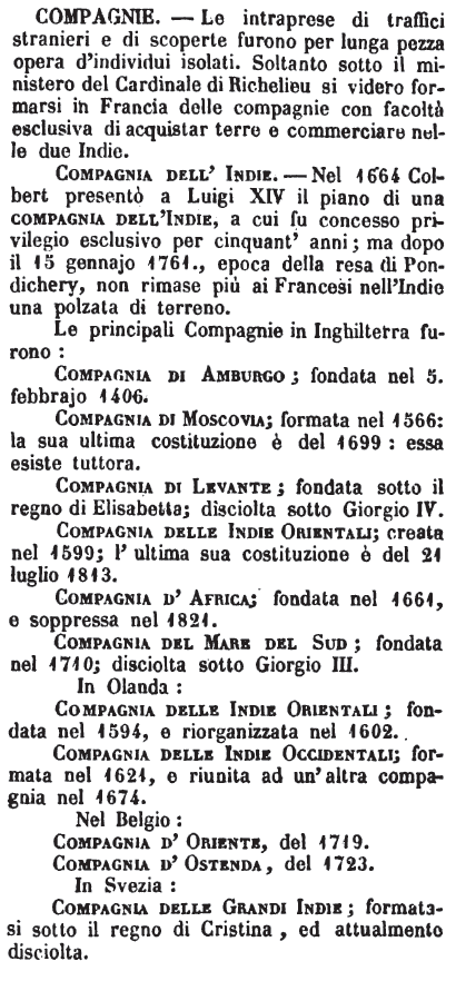 | Compagnie - Le intraprese di traffici stranieri e di scoperte furono per lunga pezza opera d'individui isolati. Soltanto sotto il ministero del Cardinale di Richelieu si videro formarsi in Francia delle compagnie con facoltà esclusiva di acquistar terre e commerciare nelle due Indie.
