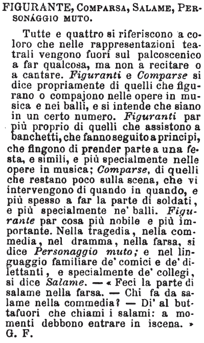 | Figurante, Comparsa, Salame, Personaggio muto - Tutte e quattro si riferiscono a coloro che nelle rappresentazioni teatrali vengono fuori sul palcoscenico a far qualcosa, ma non a recitare o a cantare. Figuranti e Comparse si dice propriamente di quelli che figurano o compajono nelle opere in musica e nei balli, e si intende che siano in un certo numero. Figuranti par più proprio di quelli che assistono a banchetti, che fanno seguito a principi, che fingono di prender parte a una festa, e simili, e più specialmente nelle opere in musica; Comparse, di quelli che restano poco sulla scena, che vi intevengono di quando in quando, e più spesso a far la parte di soldati, e più specialmente ne' balli. Figurante par cosa più nobile e più importante. Nella tragedia, nella commedia, nel dramma, nella farsa, si dice Personaggio muto; e nel linguaggio familiare de' comici e de' dilettanti, e specialmente de' collegi, si dice Salame. - «Feci la parte di salame nella farsa. - Chi fa da salame nella commedia? - Di' al buttafuori che chiami i salami: a momenti debbono entrare in iscena.» G. F. [immagine] |