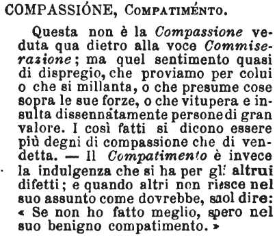 | Compassione, Compatimento - Questa non è la Compassione veduta qua dietro alla voce Commiserazione; ma quel sentimento quasi di dispregio, che proviamo per colui o che si millanta, o che presume cose sopra le sue forze, o che vitupera e insulta dissennatamente persone di gran valore. I così fatti si dicono essere più degni di compassione che di vendetta. - Il Compatimento è invece la indulgenza che si ha per gli altrui difetti; e quando altri non riesce nel suo assunto come dovrebbe, suol dire: «Se non ho fatto meglio, spero nel suo benigno compatimento.» [immagine] |