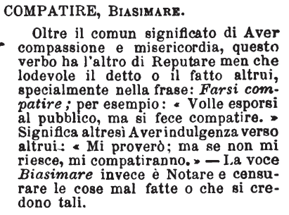 | Compatire, Biasimare - Oltre il comun significato di Aver compassione e misericordia, questo verbo ha l'altro di Reputare men che lodevole il detto o il fatto altrui, specialmente nella frase: Farsi compatire; per esempio: «Volle esporsi al pubblico, ma si fece compatire.» Significa altresì Aver indulgenza verso altrui: «Mi proverò; ma se non mi riesce, mi compatiranno.» - La voce Biasimare invece è Notare e censurare le cose mal fatte o che si credono tali. [immagine] |