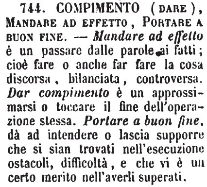 | Compimento (dare), Mandare ad effetto, Portare a buon fine - Mandare ad effetto è un passare dalle parole ai fatti; cioè fare o anche far fare la cosa discorsa, bilanciata, controversa. Dar compimento è un approssimarsi o toccare il fine dell'operazione stessa. Portare a buon fine, dà ad intendere o lascia supporre che si sian trovati nell'esecuzione ostacoli, difficoltà, e che vi è un certo merito nell'averli superati. [immagine] |