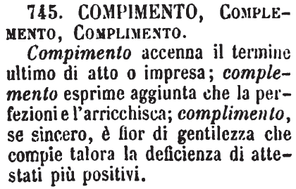 | Compimento, Complemento, Complimento - Compimento accenna il termine ultimo di atto o impresa; complemento esprime aggiunta che la perfezioni e l'arricchisca; complimento, se sincero, è fior di gentilezza che compie talora la deficienza di attestati più positivi. [immagine] |