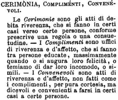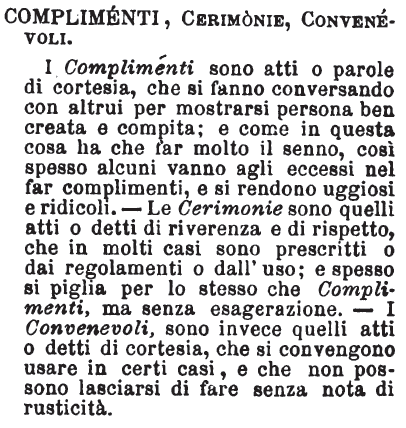 | Complimenti, Cerimonie, Convenevoli - I Compliménti sono atti o parole di cortesia, che si fanno conversando con altrui per mostrarsi persona ben creata e compita; e come in questa cosa ha che far molto il senno, così spesso alcuni vanno agli eccessi nel far complimenti, e si rendono uggiosi e ridicoli. – Le Cerimonie sono quelli atti o detti di riverenza e di rispetto, che in molti casi sono prescritti o dai regolamenti o dall’uso; e spesso si piglia per lo stesso che Complimenti, ma senza esagerazione. - I Convenevoli, sono invece quelli atti o detti di cortesia, che si convengono usare in certi casi, e che non possono lasciarsi di fare senza nota di rusticità. [immagine] |