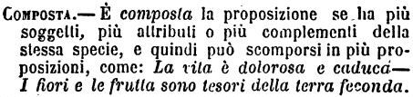 | Composta - È composta la proposizione se ha più soggetti, più attributi o più complementi della stessa specie, e quindi può scomporsi in più proposizioni, come: La vita è dolorosa e caduca - I fiori e le frutta sono tesori della terra feconda. [immagine] |