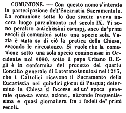 | Comunione - Con questo nome s'intende la partecipazione dell'Eucaristia Sacramentale. La comunione sotto le due specie aveva ancora luogo parzialmente nel secolo IX. Vi sono peraltro antichissimi esempj, anco da' primi secoli di comunioni sotto una specie sola. Varia è stata su di ciò la pratica della Chiesa, secondo le circostanze. Si vuole che la comunione sotto una sola specie cominciasse in Occidente nel 1090. sotto il papa Urbano II. Egli è in conformità del precetto del quarto Concilio generale di Laterano tenutosi nel 1215, che i Cattolici ricevono il Sacramento della Eucaristia nei quindici giorni di Pasqua; determinò la Chiesa si facesse ad un'epoca generale questa santa azione, altronde frequentissima e quasi giornaliera fra i fedeli de' primi secoli. [immagine] |