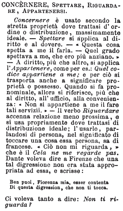 Concernere, Spettare, Riguardare, Appartenersi - Concernere è usato secondo la stretta proprietà dove trattasi d'ordine o distribuzione, massimamente ideale. - Spettare si applica al diritto e al dovere. - «Questa cosa spetta a me il farla. - Quel grado spettava a me, che ero più anziano.» - A diritto, più che altro, si applica l'Appartenere, come per es.: Quel codice appartiene a me; e per ciò si trasporta anche a significare proprietà o possesso. Quando si fa pronominale, allora si riferisce, più che al diritto, all'ufficio, alla convenienza: «Non si appartiene a me il fare tali servizii.» - Il verbo Riguardare accenna relazione meno prossima, e si usa propriamente dove trattasi di distribuzione ideale; l'usarlo, parlandosi di persona, nel significato di toccare una cosa essa persona, sa di francese. «Ciò non mi riguarda,» che è il Cela ne me regarde pas. Dante voleva dire a Firenze che una tal digressione non era stata appropriata ad essa, e scrisse: