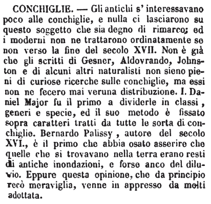 | Conchiglie - Gli antichi s'interessavano poco alle conchiglie, e nulla ci lasciarono su questo soggetto che sia degno di rimarco; ed i moderni non ne trattarono ordinatamente se non verso la fine del secolo XVII. Non è già che gli scritti di Gesner, Aldovrando, Johnston e di alcuni altri naturalisti non sieno pieni di curiose ricerche sulle conchiglie, ma essi non ne fecero mai veruna distribuzione. I. Daniel Major fu il primo a dividerle in classi, generi e specie, ed il suo metodo è fissato sopra caratteri tratti da tutte le sorta di conchiglie. Bernardo Palissy, autore del secolo XVI., è il primo che abbia osato asserire che quelle che si trovavano nella terra erano resti di antiche inondazioni, e forse anco del diluvio. Eppure questa opinione, che da principio recò meraviglia, venne in appresso da molti adottata. [immagine] |