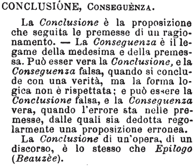 | Conclusione, Conseguenza - La Conclusione è la proposizione che seguita le premesse di un ragionamento. - La Conseguenza è il legame della medesima e della premessa. Può esser vera la Conclusione, e la Conseguenza falsa, quando si conclude con una verità, ma la forma logica non è rispettata; e può essere la Conclusione falsa, e la Conseguenza vera, quando l'errore sta nelle premesse, dalle quali sia dedotta regolarmente una proposizione erronea.